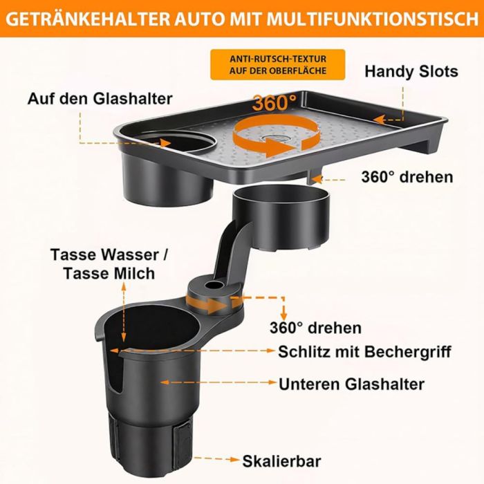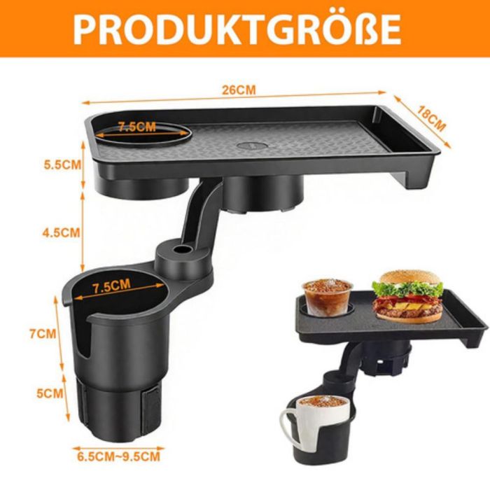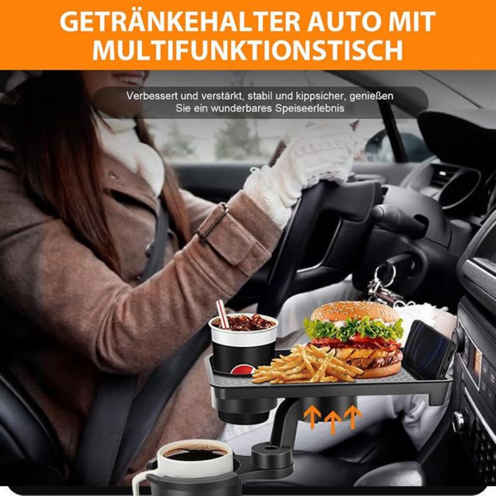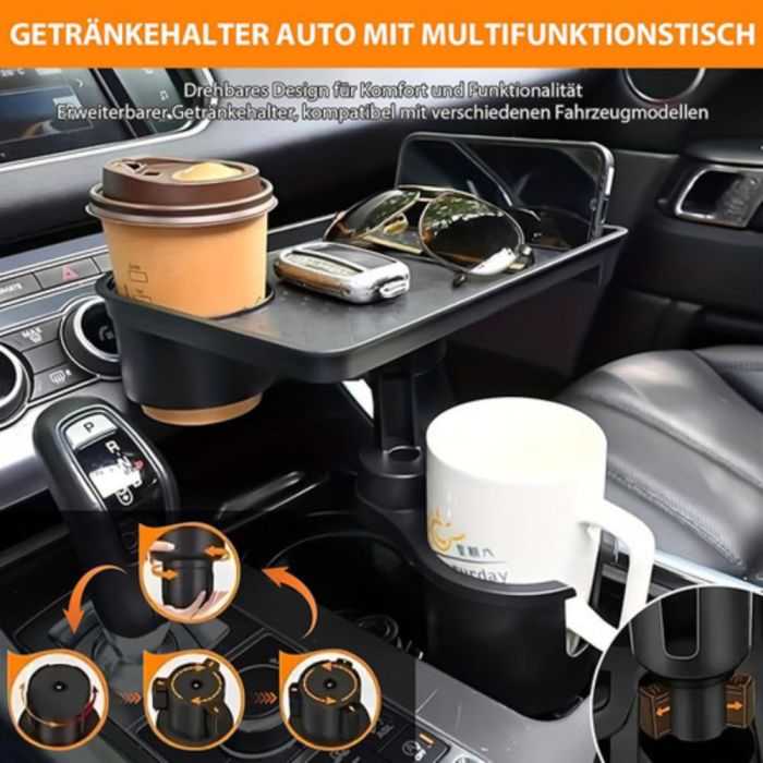 This Multi-Function Car Cup Stand with Rotating Tray made of durable ABS, features a wide upper platform for food and essentials, equipped with phone slots and dual cup holders, 360-degree rotating design for enhanced convenience while driving