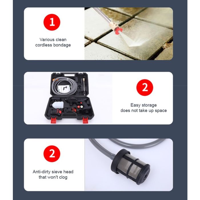 This pressure water gun offers a highly concentrated flow of water with a 30 bar cycle for efficient cleaning of any surface. It comes with foam bottle makes car washing process more convenient, 5m hose for longer distance use and 2000mAh highly efficient lithium battery can be used for long time without interruption
