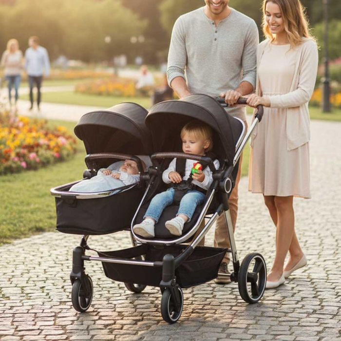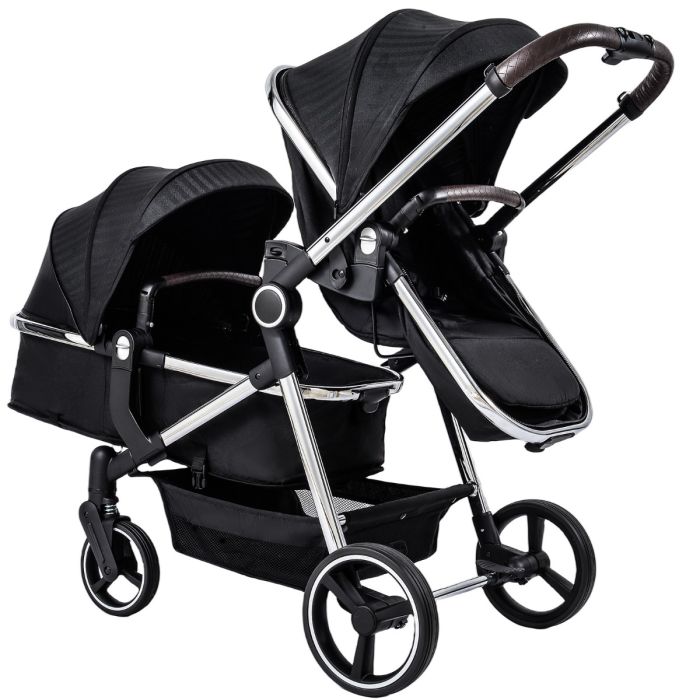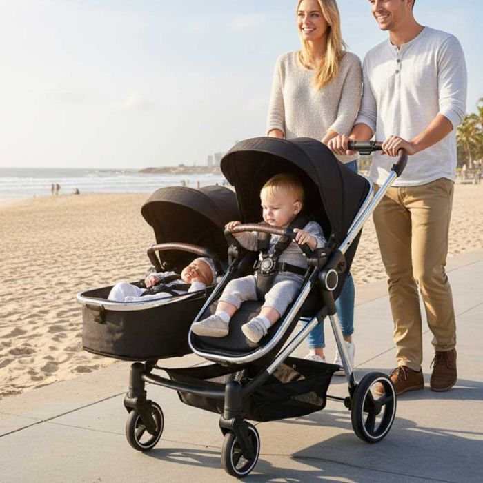 This stroller features a high-performance design that combines comfort and safety for children of all ages. Each seat can support up to 22 kg, with a front seat suitable for children from 6 to 36 months, and a rear seat suitable from birth to 36 months. The wheels absorb shocks to provide a smooth and stable ride, and the foldable design makes it easy to store and transport.Today's Deal is Multi-Functional Two-Way Double Baby Stroller