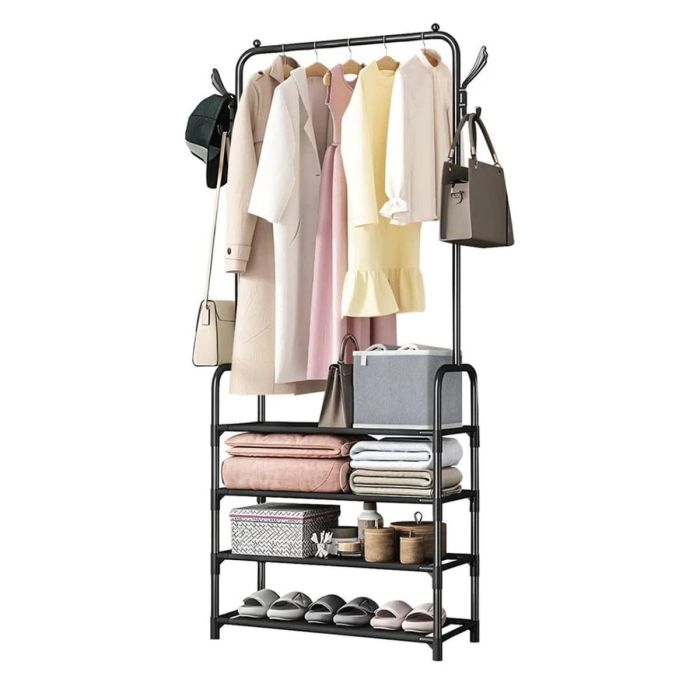 - Made of high-quality metal materials, this clothing rack provides good durability and stability for long-term use. The sturdy structure makes the clothes stand to bear the appropriate weight, and your clothes, shoes, hats, and bags can be effectively stored