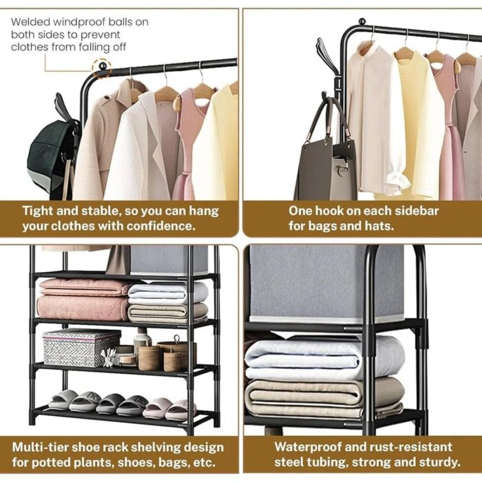 - The hanging rack has enough space at the top for clothes, 4-tier storage racks at the bottom that can be used to store your shoes or boxes, and 4 hooks on the side to give you extra storage space to hang hats and bags. There are two non-slip beads on the top of the rolling garment rack, which can prevent the clothes from falling off