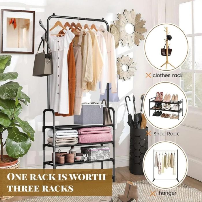 - With it’s compact design and 5-tier storage racks and shelving, this rolling clothes rack efficiently maximizes your available space. The 5-tier clothing racks provide ample room for organizing and storing clothes, shoes, hats, and bags without occupying excessive floor area