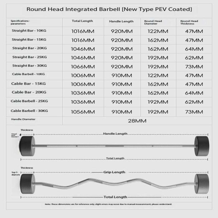 - Straight bar weights: 10, 15, 20, 25, 30 kg