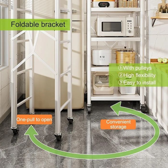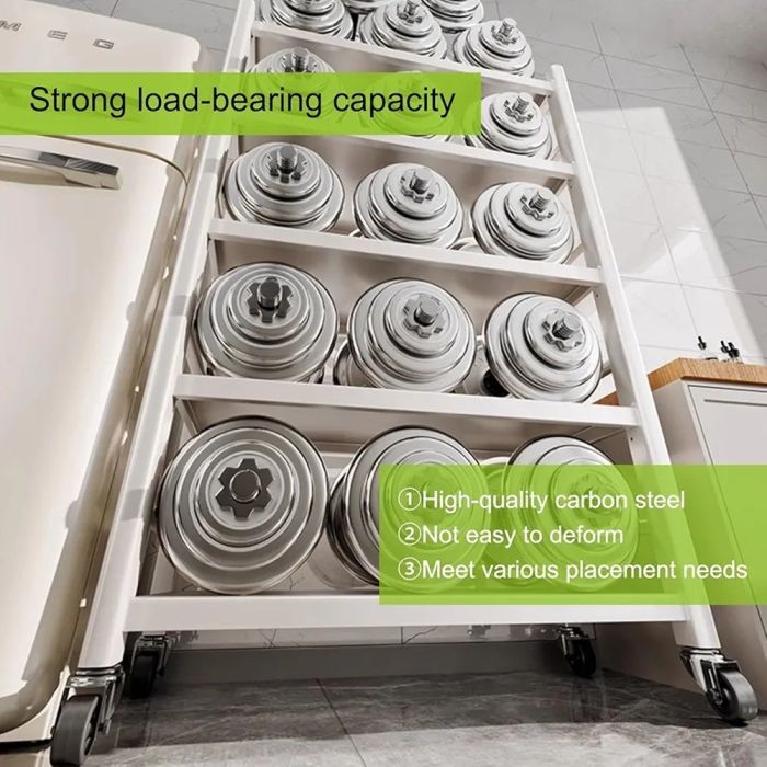 This high-quality organizer combines functionality and elegance, helping you organize your kitchen tools professionally. It features a strong and durable metal frame designed to last, with spacious shelves ideal for storing small appliances, cooking utensils, spice jars, or canned goods. It also comes with 360° rotating wheels for easy movement around the kitchen, giving you perfect organization and extra space to make your kitchen more organized and beautiful every day.