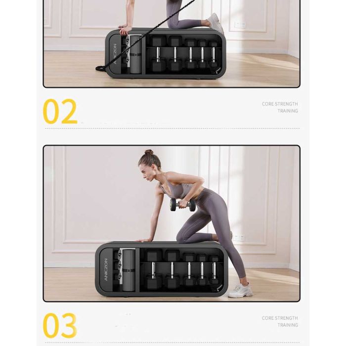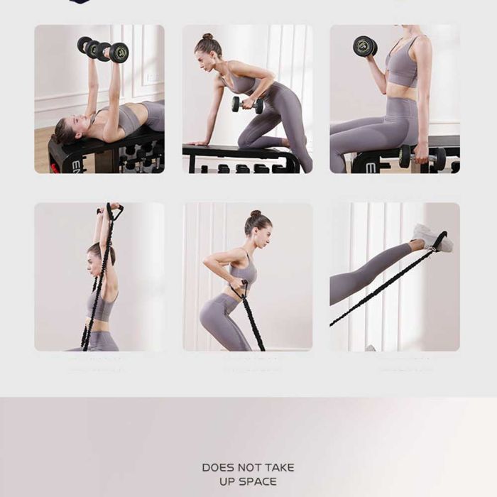 This multifunctional storage bench with training tools combines comfort, organization, and performance. It provides a smart space to store dumbbells and resistance ropes neatly, with a durable design that is easy to move around the home.