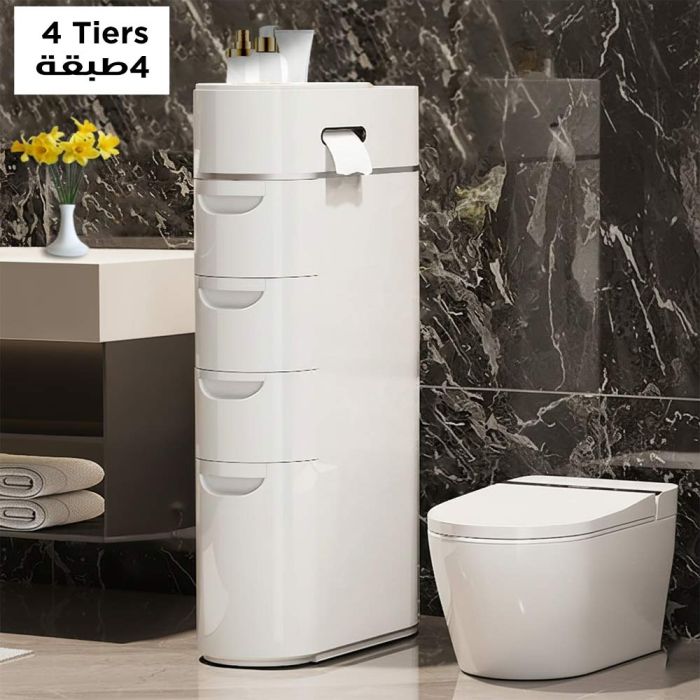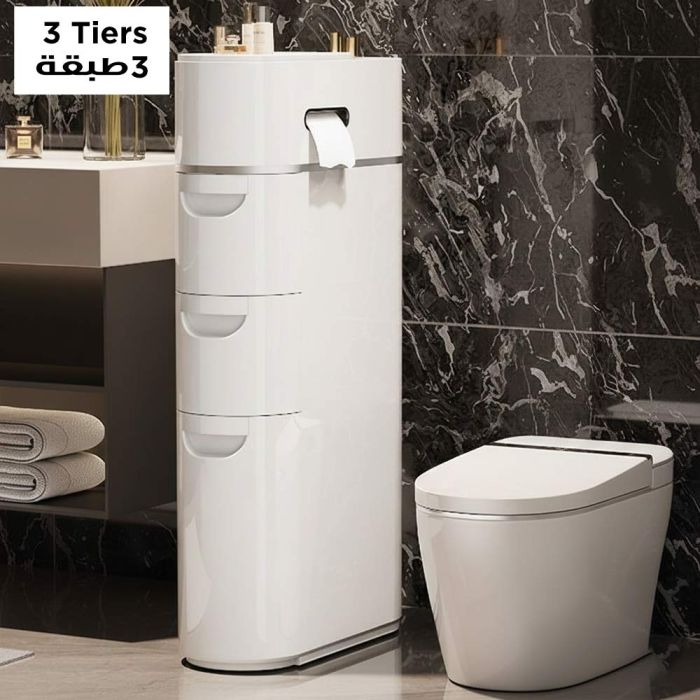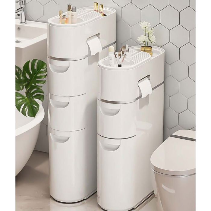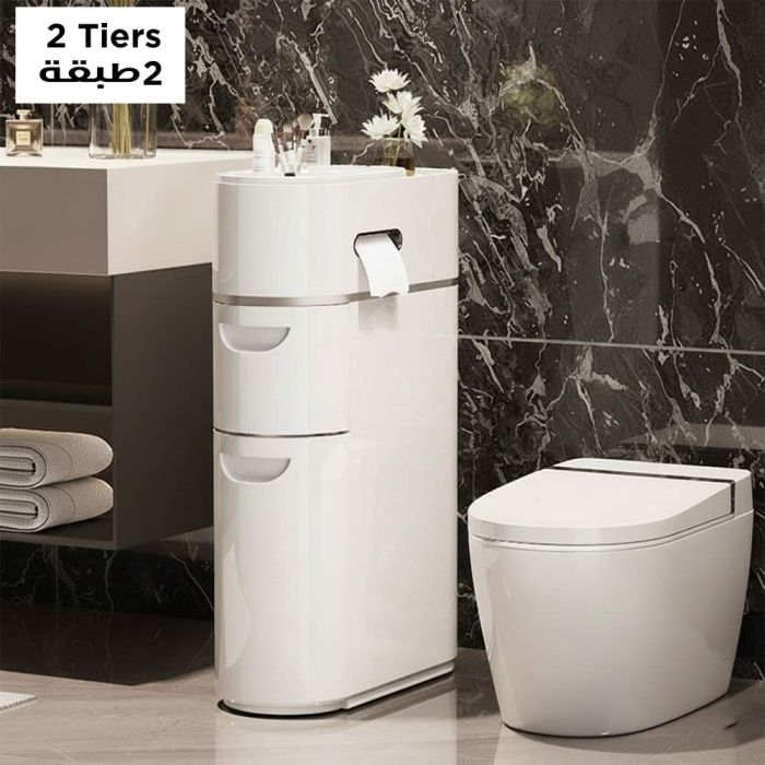 This Multifunction Side Organizer with Tissue Holder is made from durable plastic, a slim design suitable for bathrooms kitchens and any home space, organized layers for easy storage, a built in tissue holder for quick access, free standing placement, a clean elegant look