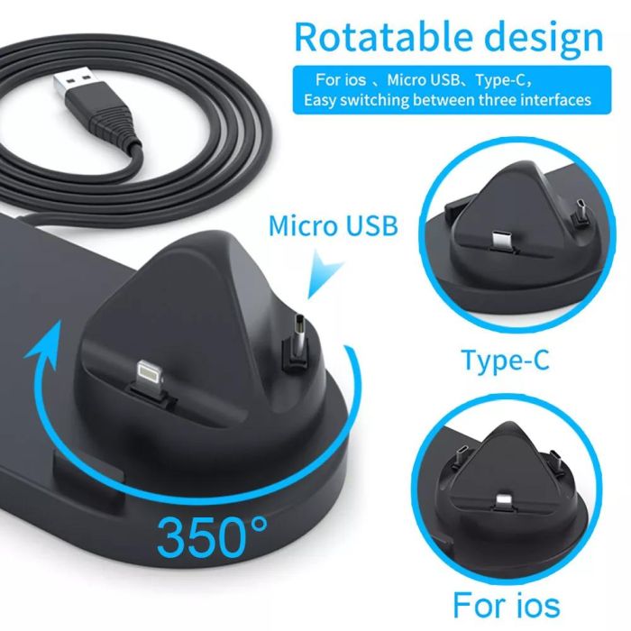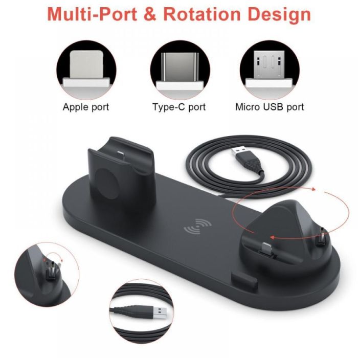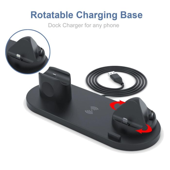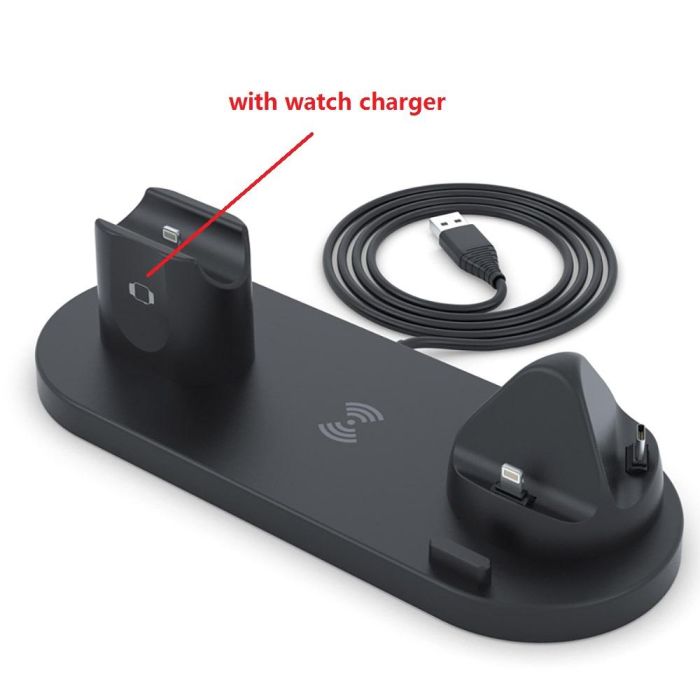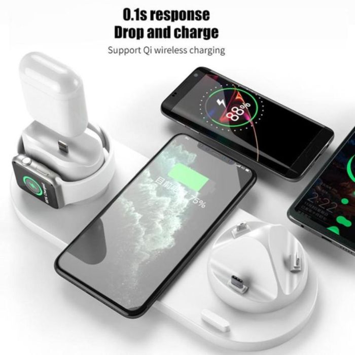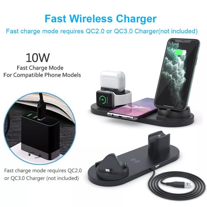A practical wireless charging stand for charging your phone, watch, and earbuds simultaneously, featuring a stylish design and up to 15W charging power.