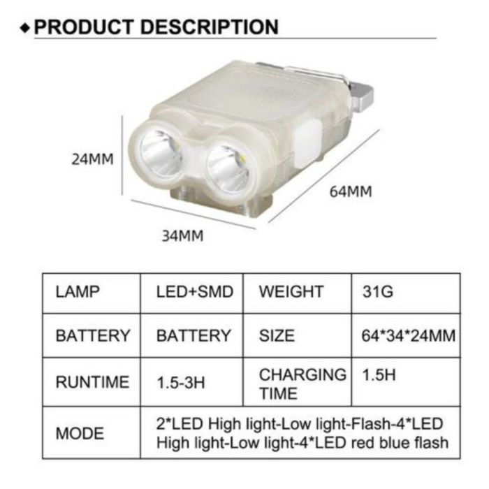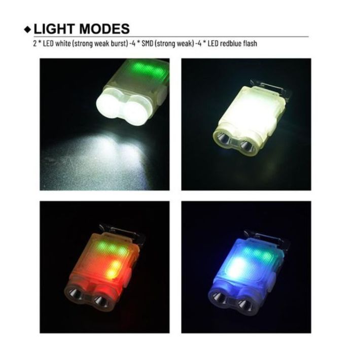 - Modes: Strong light, weak light, flash White red and blue flash