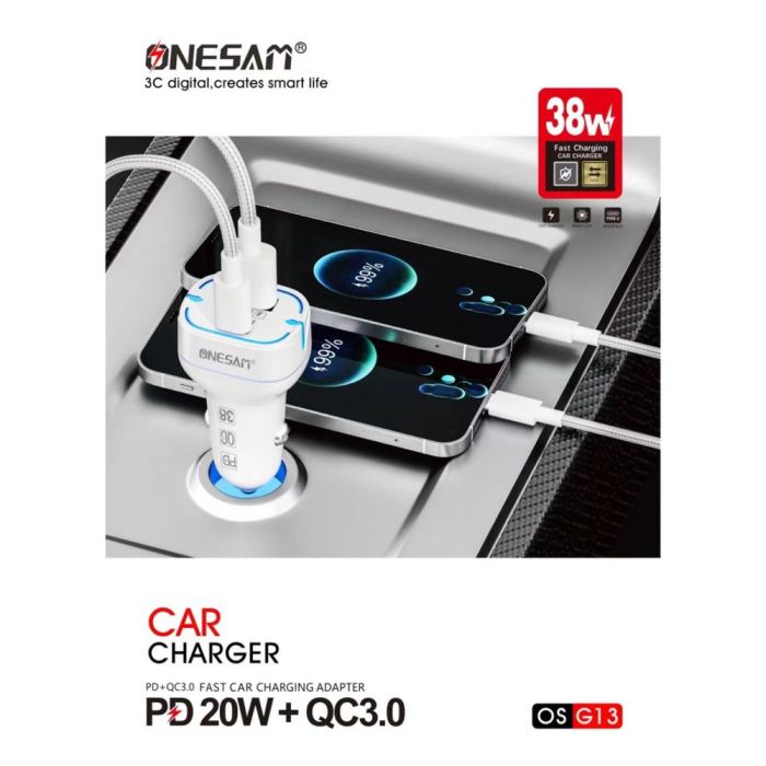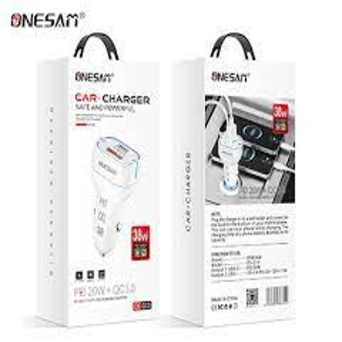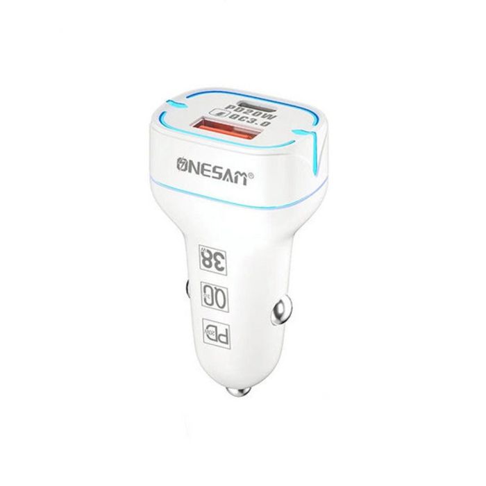 Charge your devices on the go with ease with the ONESAM 38W Car Charger. Featuring a compact and lightweight design, it includes a USB port that supports 3.0A fast charging, as well as a 20W PD port for charging modern Type-C devices. Made of durable plastic, it delivers reliable performance and optimal charging speed on every journey. It's the smart solution for charging phones and tablets in the car.