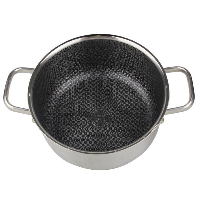 A three-layer stainless steel cooking pot for even heat distribution and optimal performance for everyday cooking.