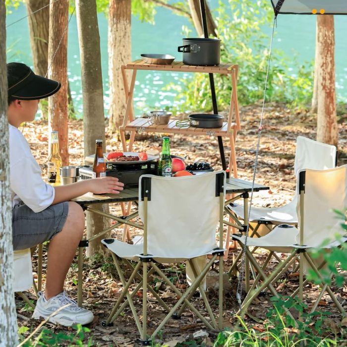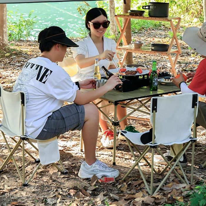 A portable and comfortable seating option for outdoor activities. It features a lightweight design that can be easily folded for transport and storage. The chair is made with durable materials to withstand various weather conditions, making it ideal for camping, picnics, and other outdoor events