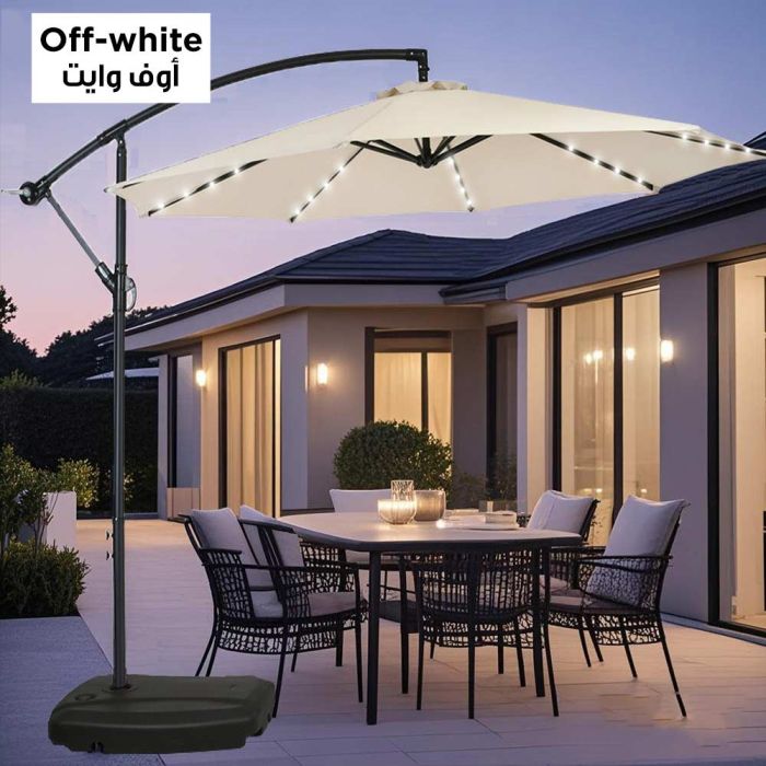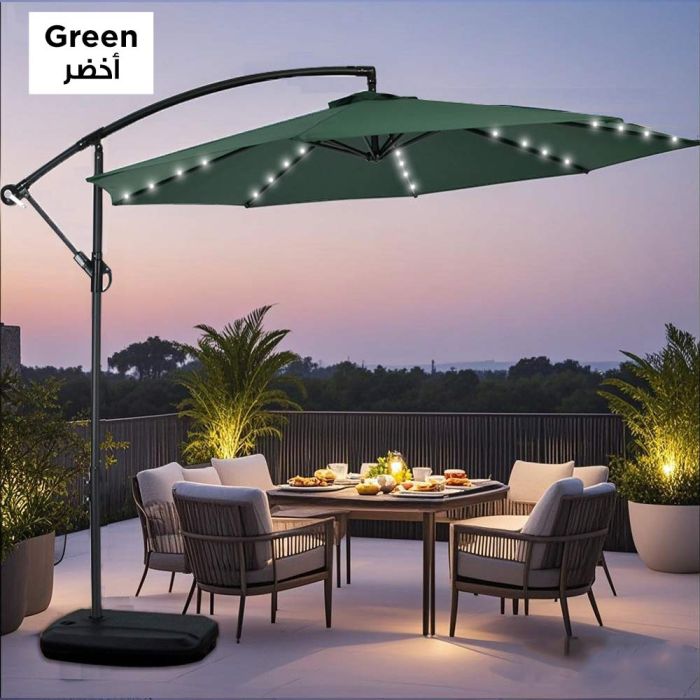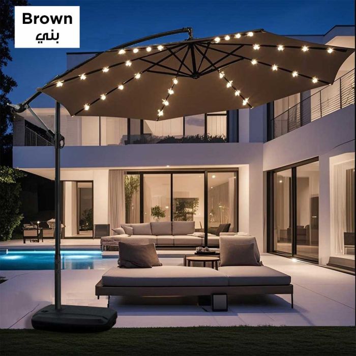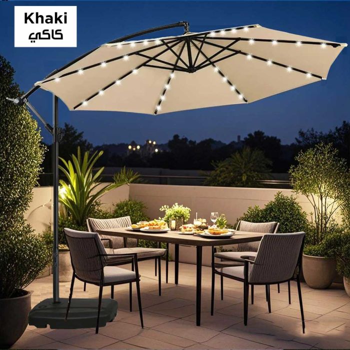 This Outdoor Umbrella With Remote Lights is made of high-quality fibers, ideal for tranquil evenings in the courtyard and balcony, featuring built-in remote-controlled LED lighting, offering sun protection by day and warm illumination by night, and comes with a strong base that ensures stability.