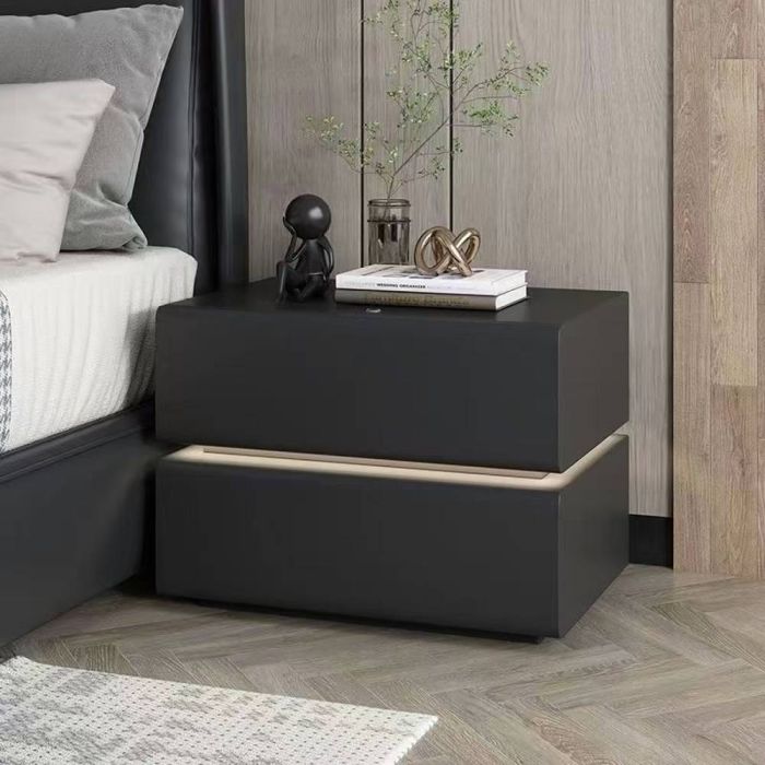 This pine wood and leather bedside table with drawers and built-in light is made with premium materials and a soft touch, featuring built-in lighting for a warm and relaxing ambiance, two spacious drawers for easy organization, a top surface perfect for decor, and quiet sliding that adds a refined touch to your room