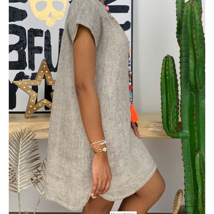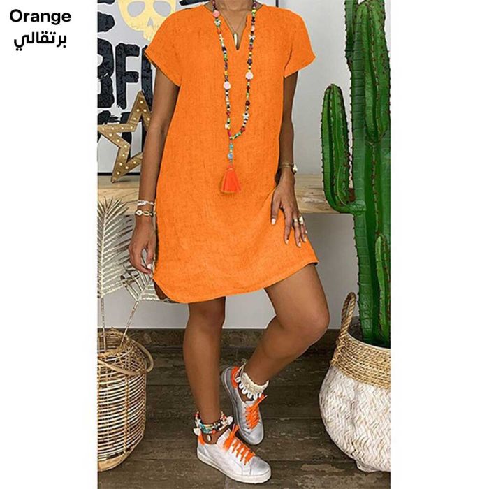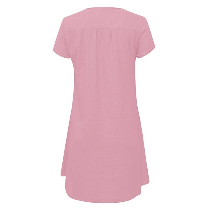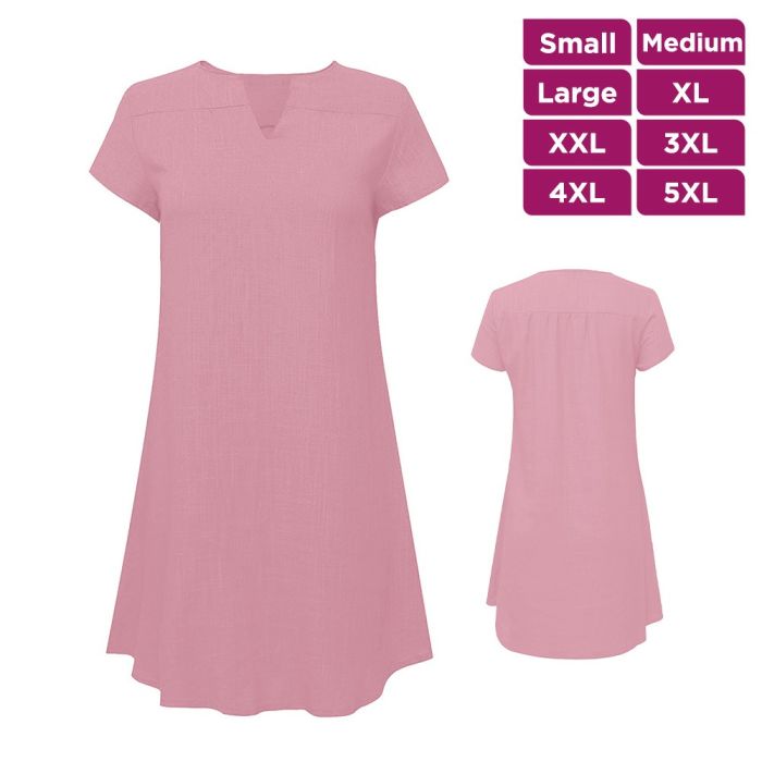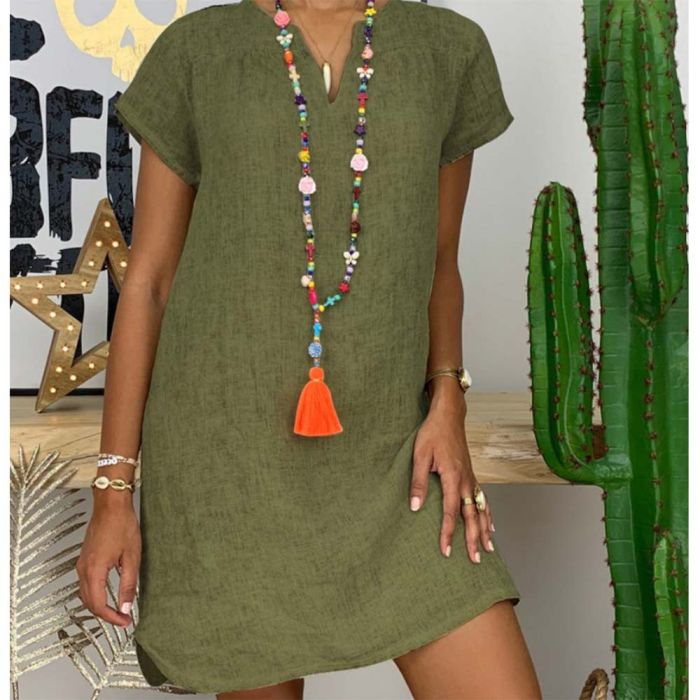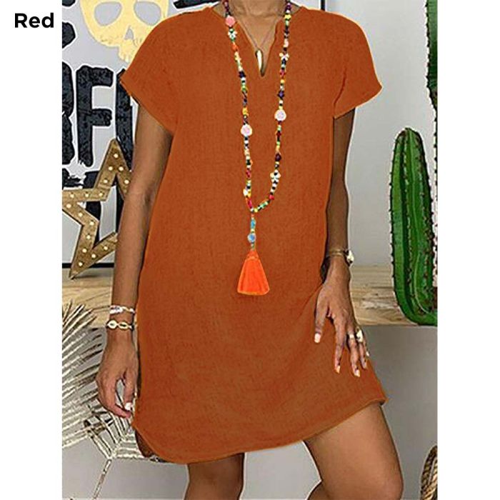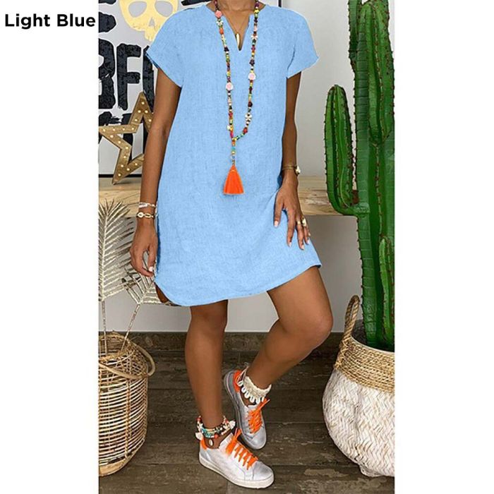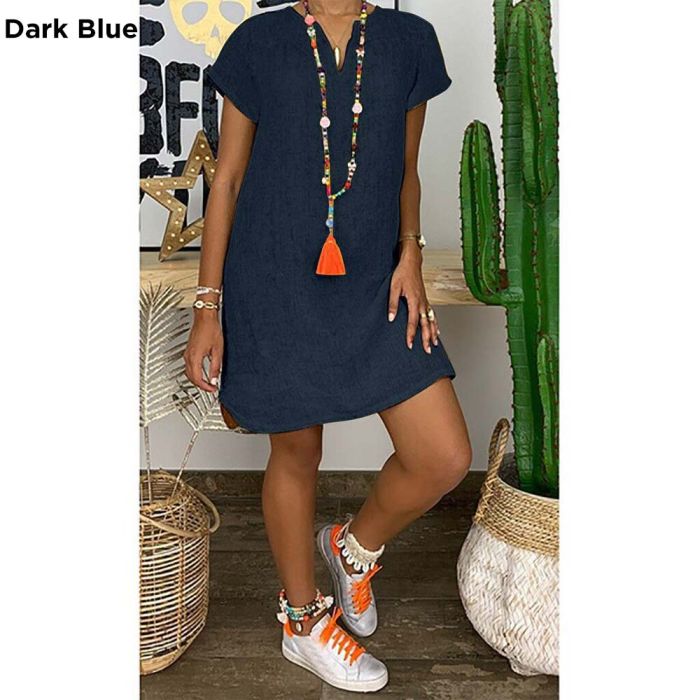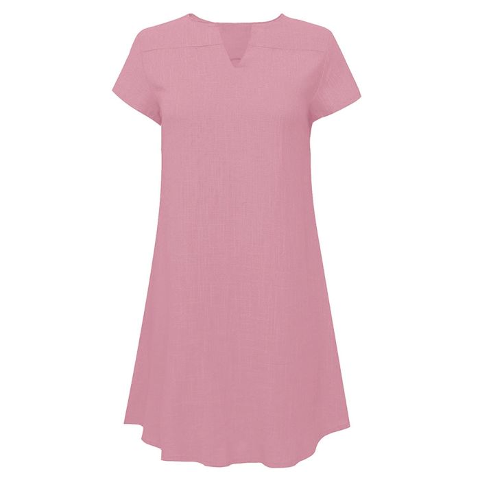 - Plain Short Dress with Short Sleeves and V-neck