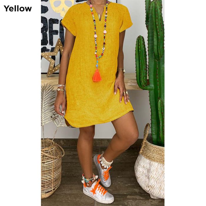 Welcome to spring and summer with this dress, a must-have for a stylish and practical look. Made from a lightweight woven fabric, it offers comfort. It features a loose, relaxed fit that drapes beautifully, while the elegant V-neck and short sleeves add a touch of sophistication. Whether you're heading out for brunch, shopping, or a casual evening out, this plain dress is easy to style with accessories.Today’s Deal is Plain Short Dress with Short Sleeves and V-neck