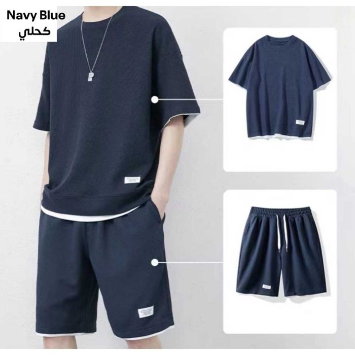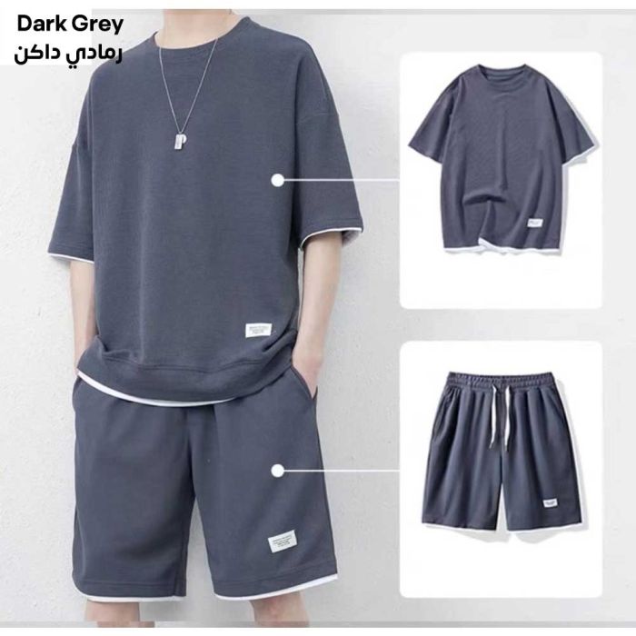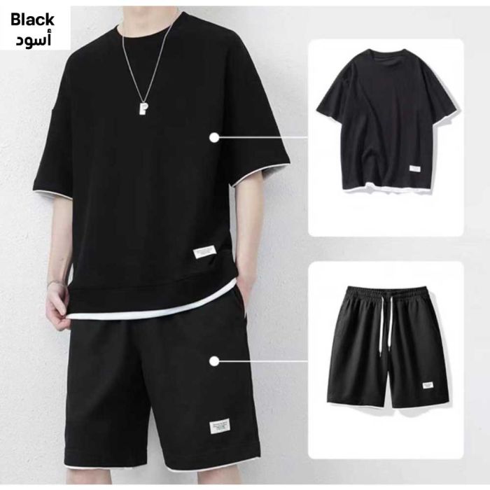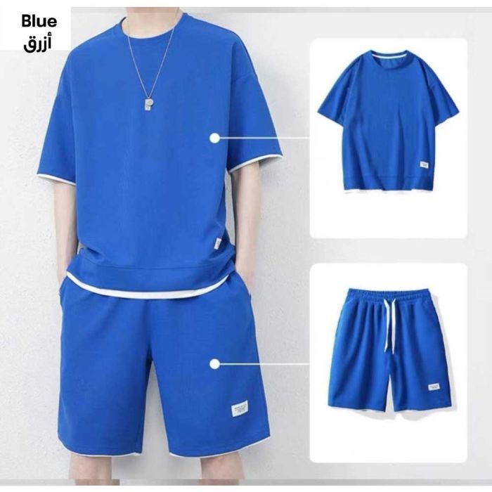 - Plain Short Sleeve Sports Shorts Set 2Pcs Set For Men