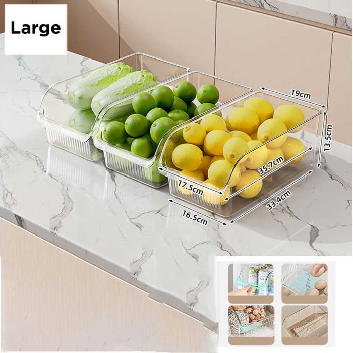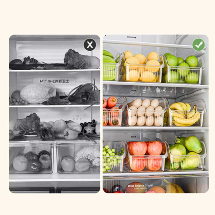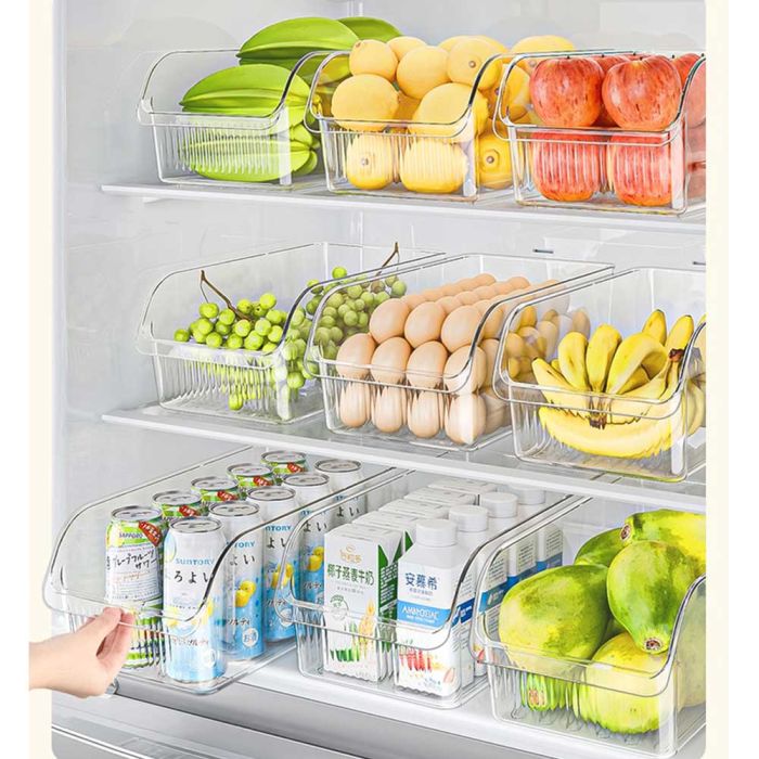 This Plastic Box for Fridge is made from food safe materials, features a clear design for easy visibility, wide front opening for easy access, comfortable handle for daily use, helping you organize your fridge neatly and keep food well arranged