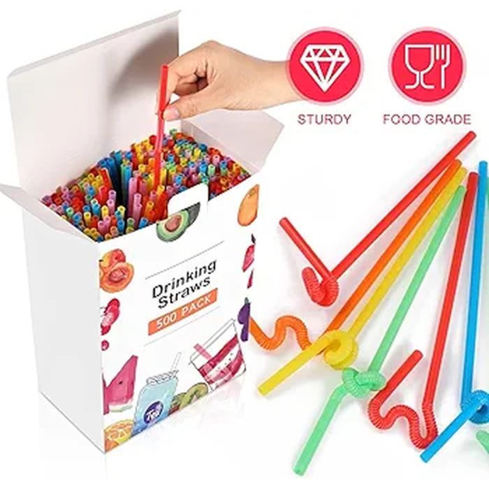 Add a touch of fun to your drinks with this set of 500 colorful plastic drinking straws. Flexible and easy to use, they're perfect for smoothies and cold drinks at parties or everyday use. Their long, bendable design makes them comfortable for all ages and adds a cheerful atmosphere to every occasion.