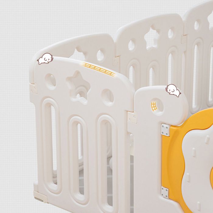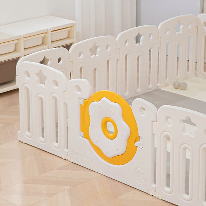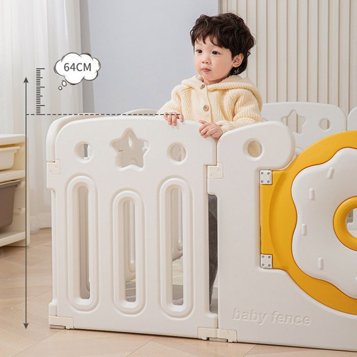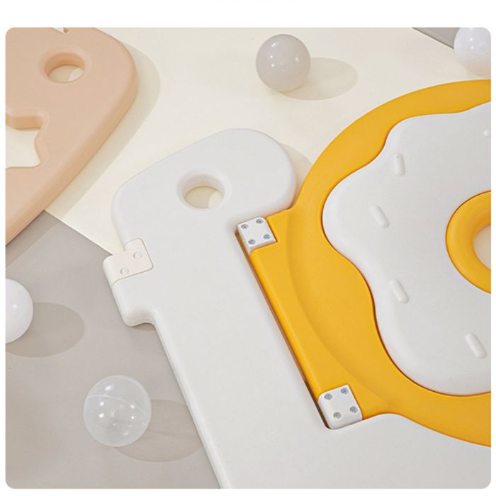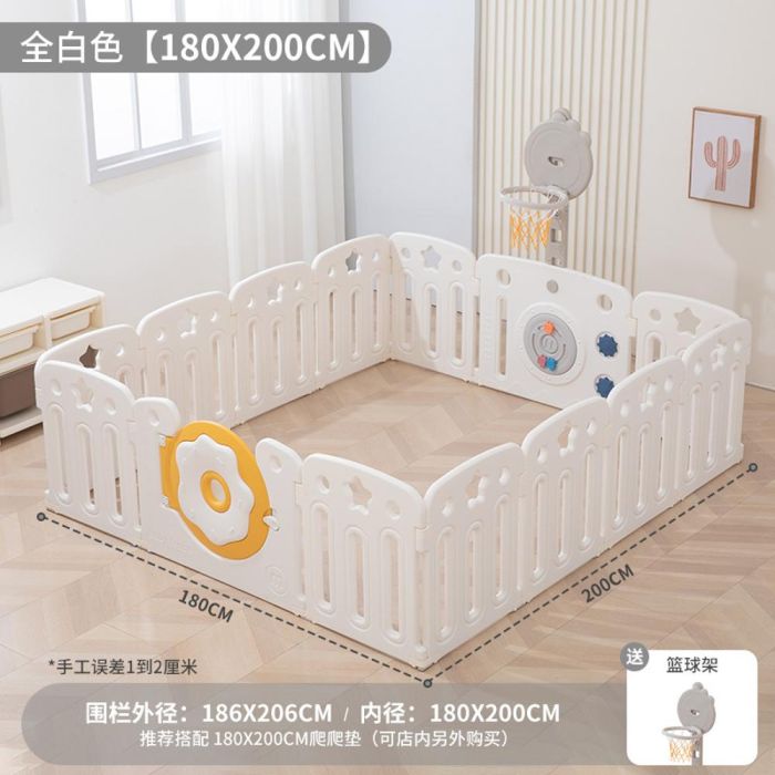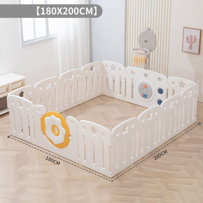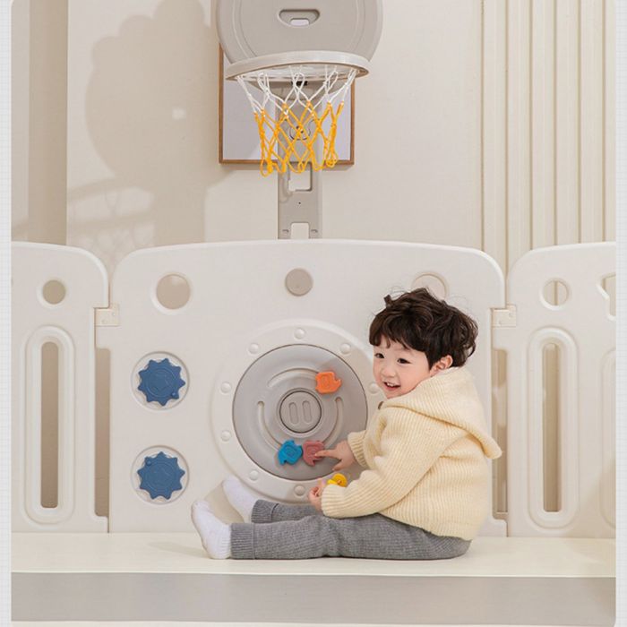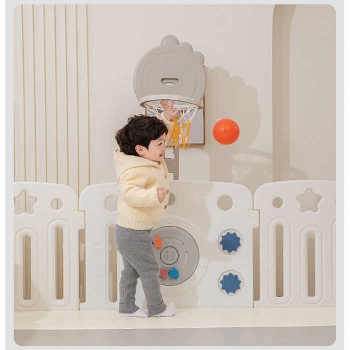 This plastic fence with basketball hoop and integrated activity panel creates a safe and engaging indoor play area, featuring a stable design with smooth edges, an interactive panel for skill development, and a basketball hoop that encourages daily movement and active play