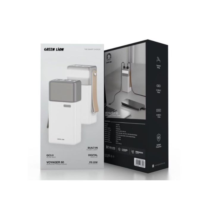 This Power Bank 60000mAh 20W by Green Lion made of high-quality components, provides fast and efficient charging, supports charging multiple devices at once, equipped with a digital display for battery level, practical design suitable for daily use and travel