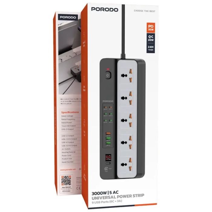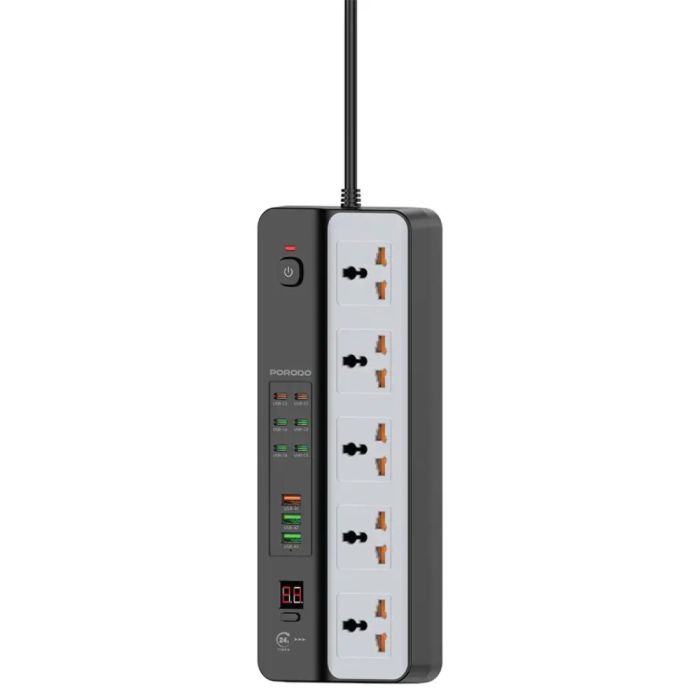 This Power Strip 3000W 5 AC Outlets 9 USB Ports by Porodo made of high-quality components, delivers stable power distribution, supports fast charging via USB ports, allows multiple devices to run at once, suitable for home and office use with a space-saving organized design
