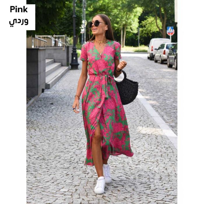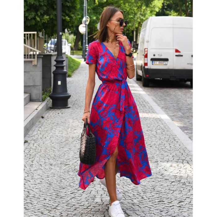 This Women's Printed Midi Dress is Made from Lightweight and Comfortable Fabric with a Printed Design and a V-neck. This Dress Features a Midi Length Cut and a Side Slit for a Flattering Touch. It is Perfect for Casual Summer Occasions and Offers a Modern and Comfortable Look. It Maintains Its Quality and Combines Elegance and Comfort in One Piece.