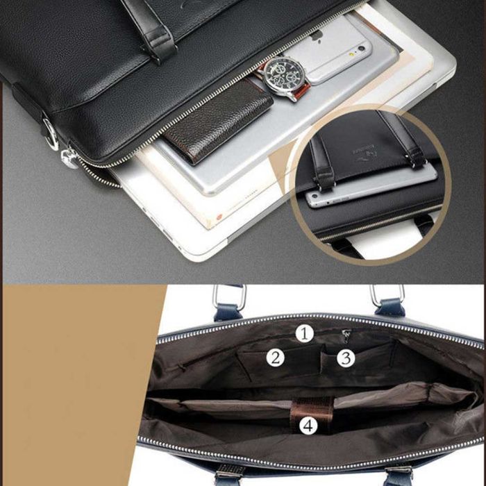 This PU leather business handbag is crafted for professionals who value elegance and practicality, made of durable material resistant to scratches, it features multiple compartments for documents, laptop, and daily essentials, with detachable shoulder strap and strong top handles, the sleek design ensures lasting quality and a refined business look