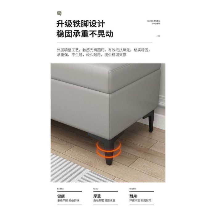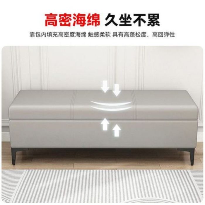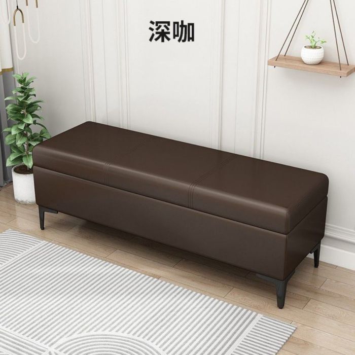 This PU Leather Long Stool with Internal Storage and Wooden Frame made of artificial wood board, comfortable sponge padding, smooth PU leather, elegant design, comfortable seating, organized storage space, ideal for entryways and modern interiors