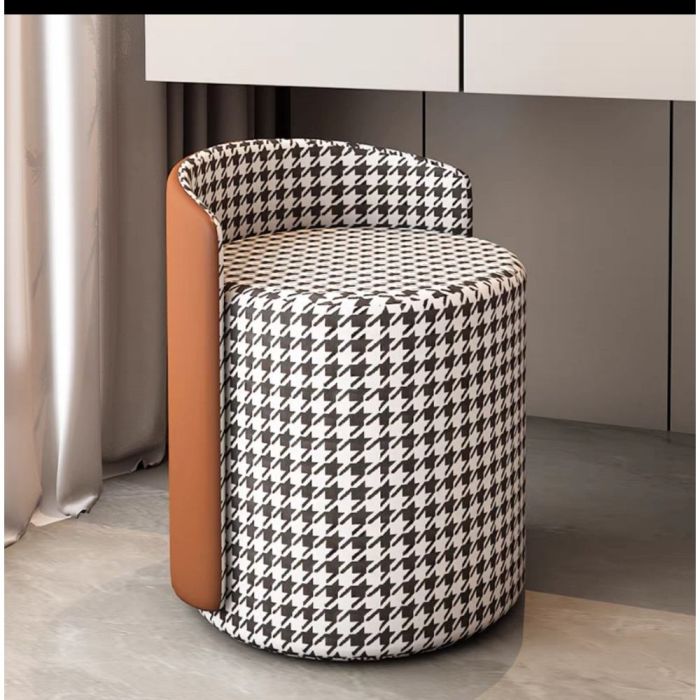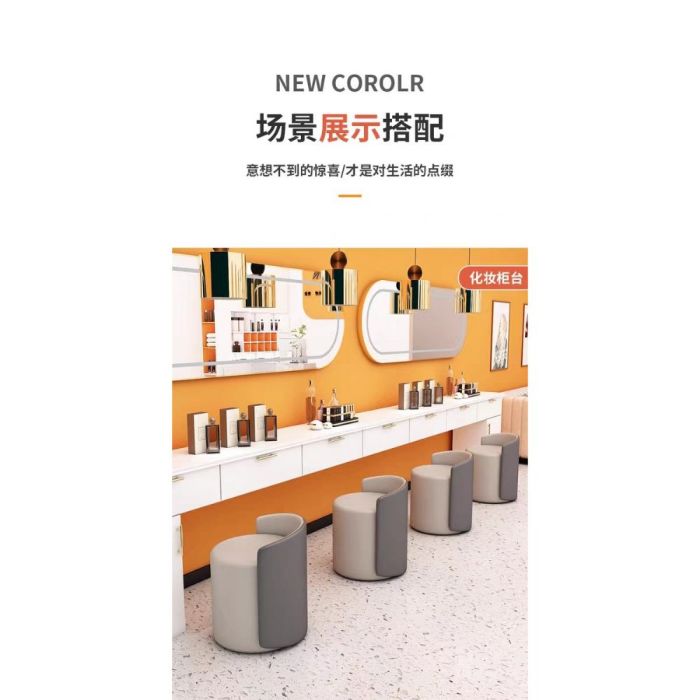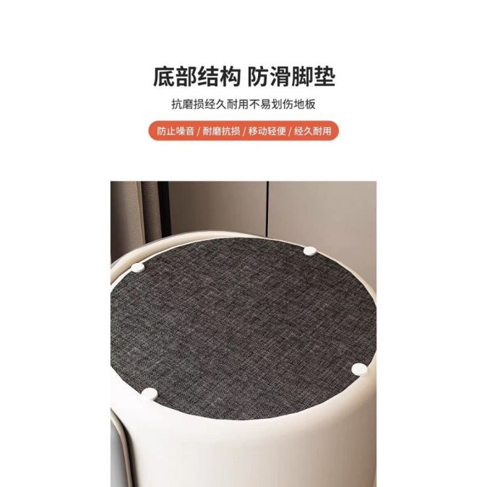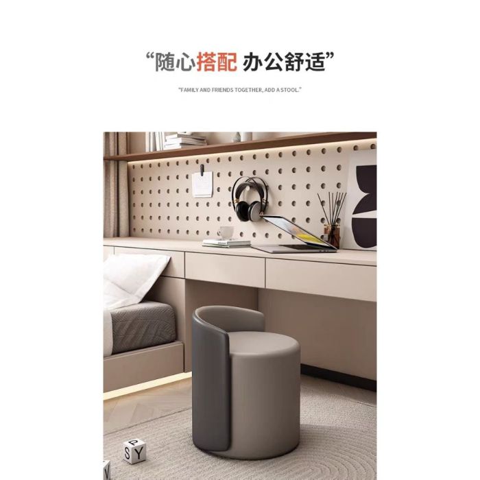 This PU Leather Round Makeup Stool with Wooden Frame made of multi-layer solid wood board, soft sponge padding, smooth PU leather, elegant design that enhances any space, comfortable seating feel, ideal for makeup areas, fitting rooms, and modern interiors