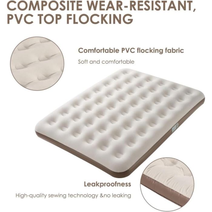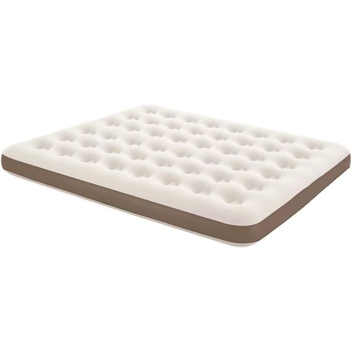 This queen-size double air mattress offers a comfortable sleeping experience thanks to its soft vinyl surface covered in velvet. It features a practical design that inflates and deflates easily, making it ideal for camping or for use at home as a temporary bed.