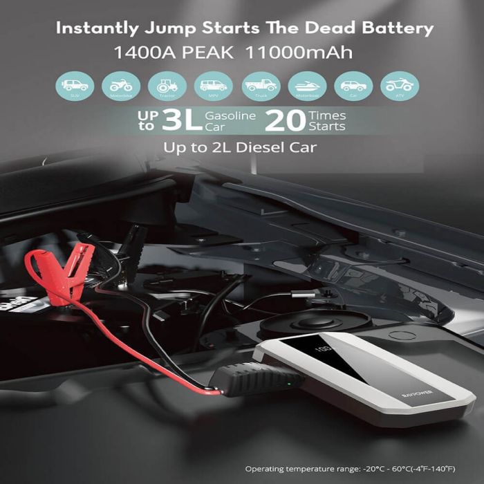 Notify meGet the limitless energy for your car and devices wherever you go. This powerful 11000mAh jump starter delivers up to 1400A peak current, easily starting 12V gas and diesel vehicles up to 3L. With versatile charging options, including a 15W Type-C input and dual USB-A outputs, it charges phones, tablets, and much more on the go. A 240 lumen LED flashlight with SOS modes adds safety for emergencies. Equipped with multiple safety protections against overcharge, overvoltage, and short circuits, making it perfect for travel and everyday use