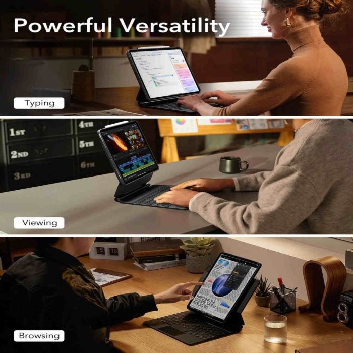 Turn your iPad into a mobile workstation with this magnetic keyboard case, featuring adjustable viewing modes, quick setup, and full protection for productivity anywhere.