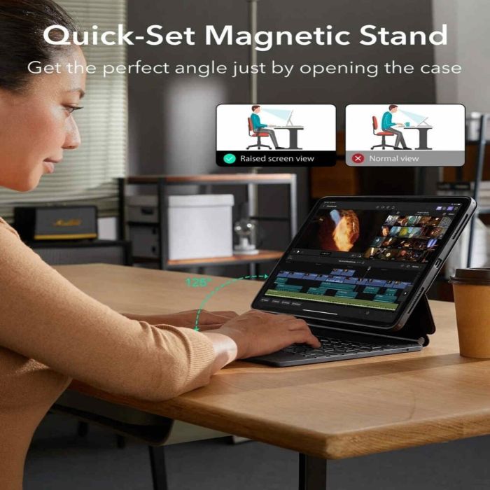 - Quick-set magnetic stand allows easy angle adjustment for typing or browsing.