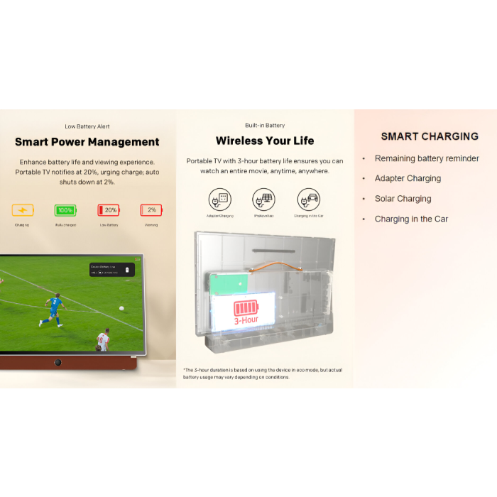Connectivity is a breeze with HDMI and USB ports, and the 2x8W speakers provide powerful sound. This versatile and feature-packed portable TV is perfect for travel, outdoor activities, or simply enjoying your favorite shows and movies anywhere you go. Elevate your entertainment experience with this all-in-one solution