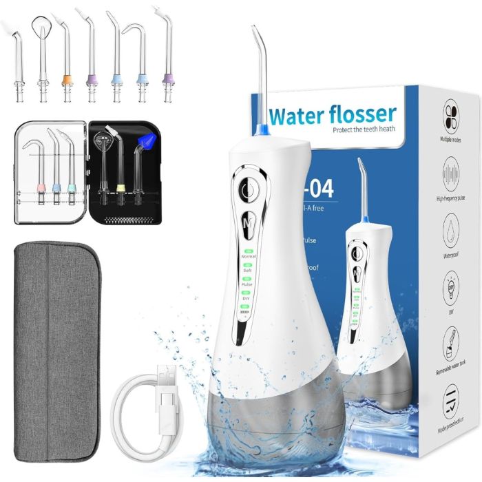 - Packaging includes: water flosser, charging cable, 7 types of tips, tips box, travel bag (Adapter not included)