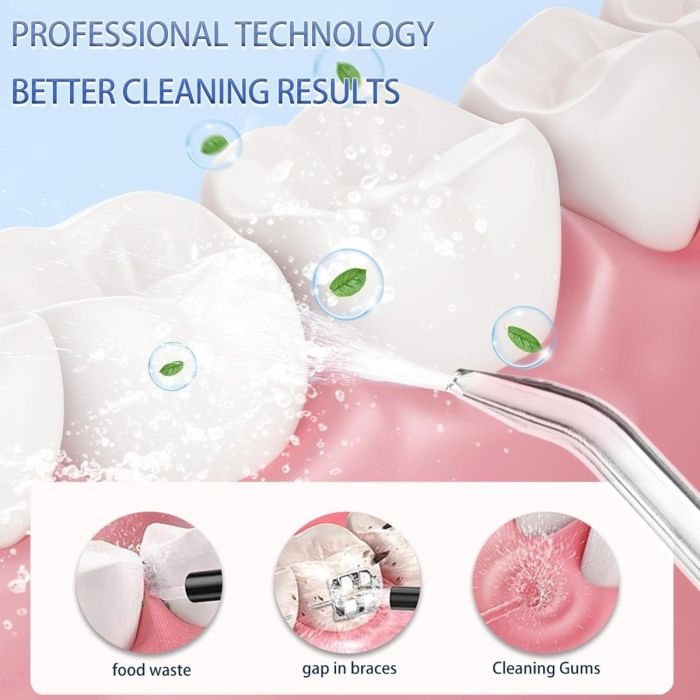 The Water Flosser Rechargeable offers deep cleaning and teeth whitening, improving gum health with high-frequency water pulses (1200-1800/min) and powerful water pressure (30-130 psi). The 0.6mm fine water flow penetrates deep into the teeth, addressing hidden oral problems, bleeding gums, and bad breath. It is also beneficial for orthodontic braces and bridge care.