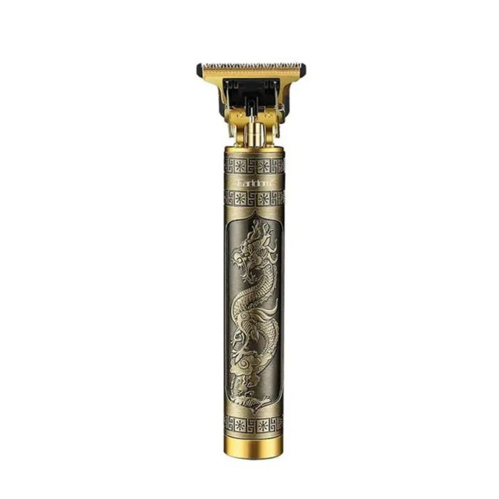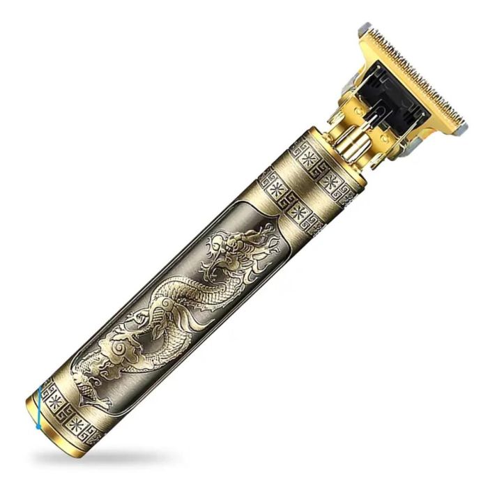 Elegant handheld hair clipper featuring a metal shell with unique embossed dragon detailing. Rechargeable via USB-C with a 400 mAh battery delivering around 45 minutes of cordless use. Powerful yet quiet motor ensures smooth trimming for head, beard, or body. Includes multiple guide combs for customizable cutting lengths and a detachable blade for easy cleaning and maintenance.