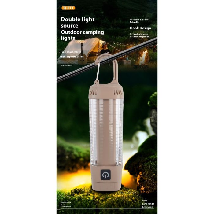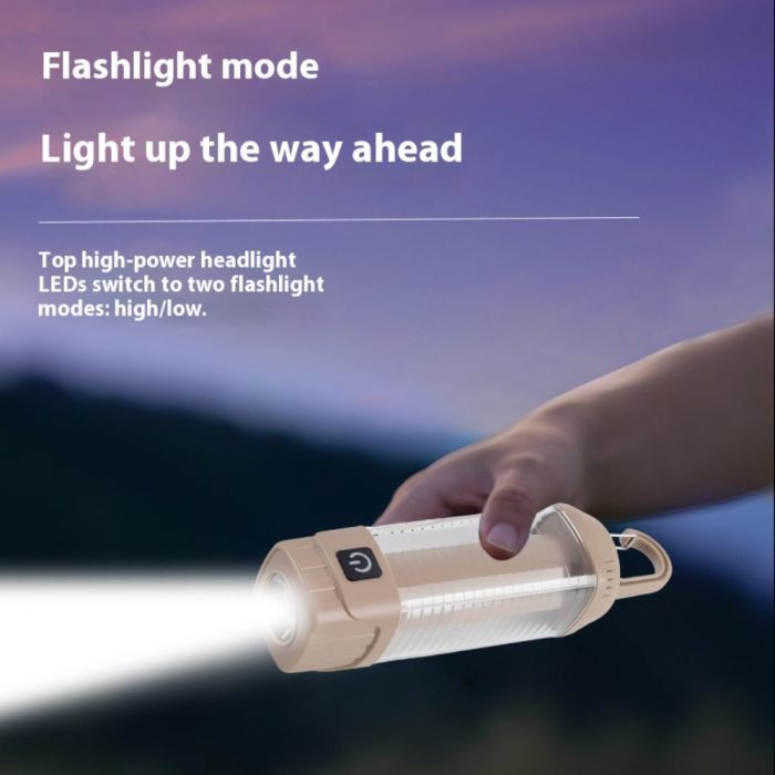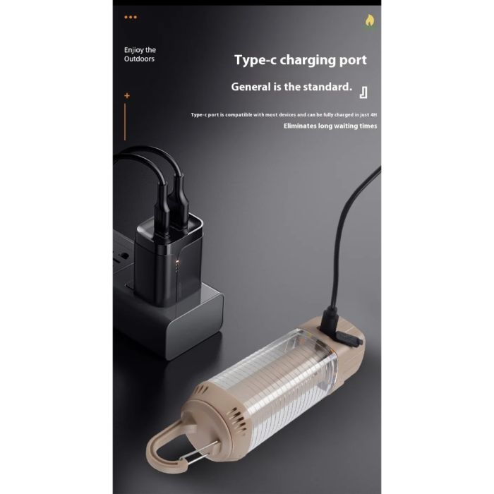 This Rechargeable LED camping light made with a durable body, provides powerful 360° illumination with multiple modes including white, warm, and red light, equipped with a rechargeable lithium battery and Type-C charging port, ideal for camping, trips, and nighttime use in various conditions