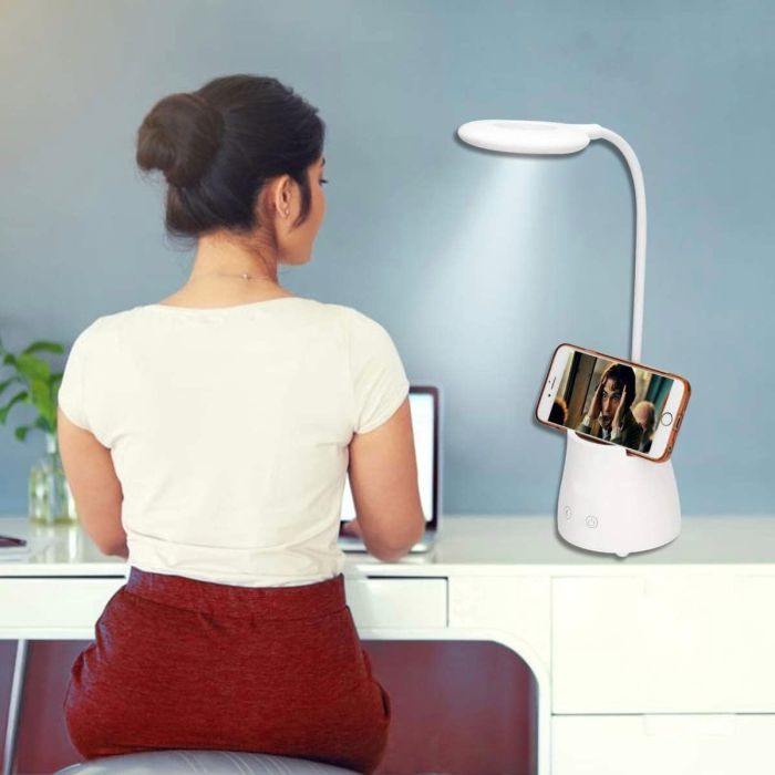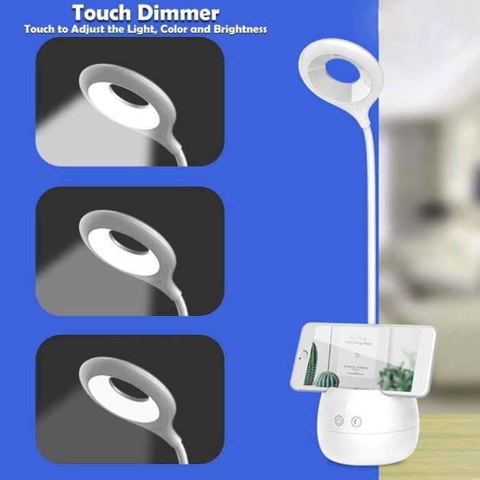 Brighten your workspace with this touch-control LED desk lamp that combines modern style and functionality. It offers three light modes and ten adjustable brightness levels for perfect illumination anytime. The base includes a pen holder and phone stand for added convenience, while the flexible 360° neck lets you position the light exactly where you need it. Rechargeable and eye-friendly, it’s ideal for study, work, or reading.