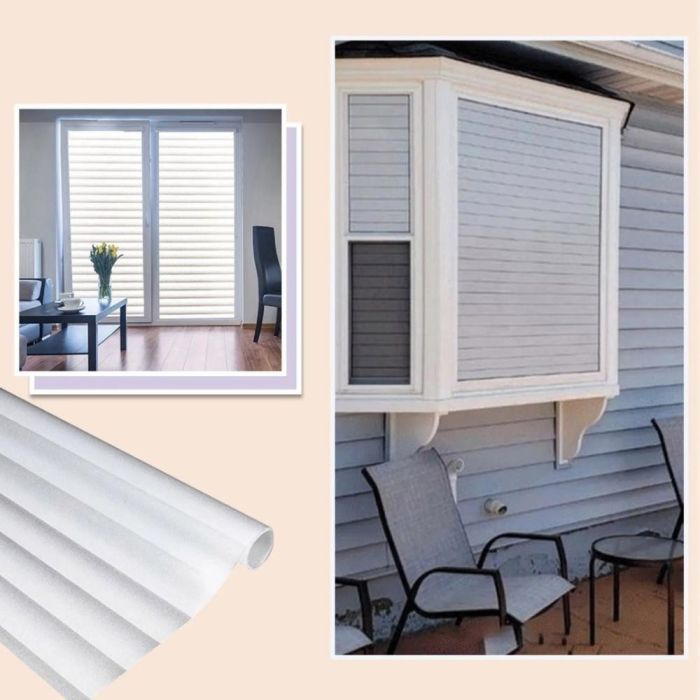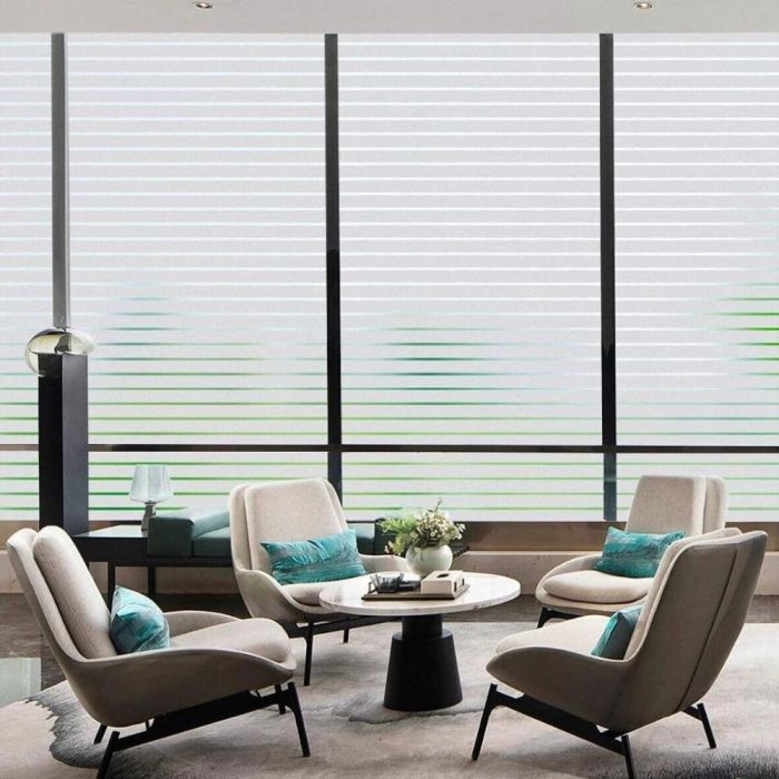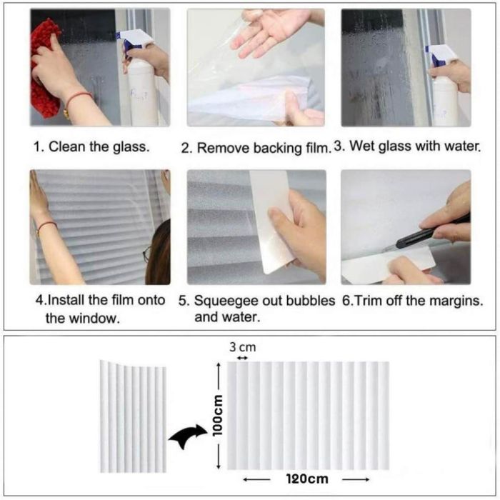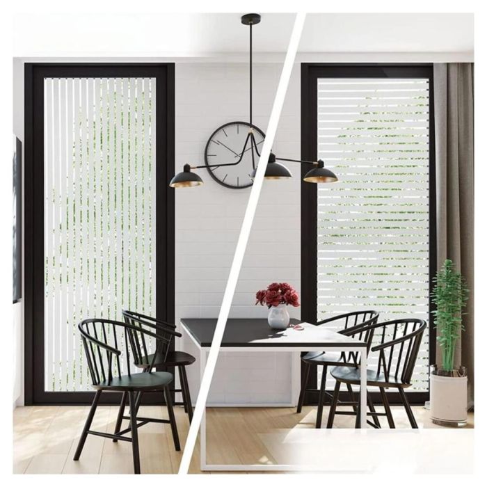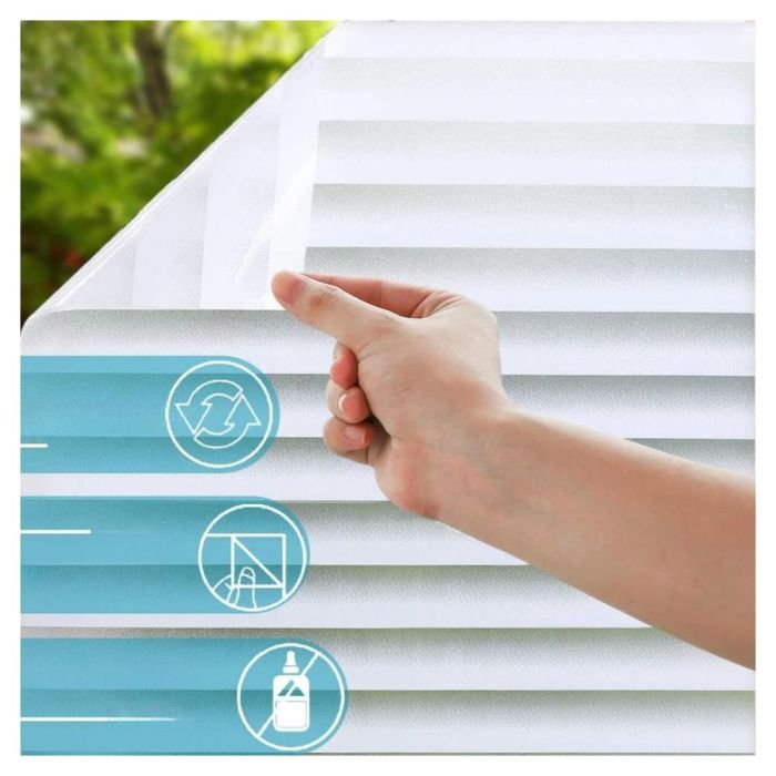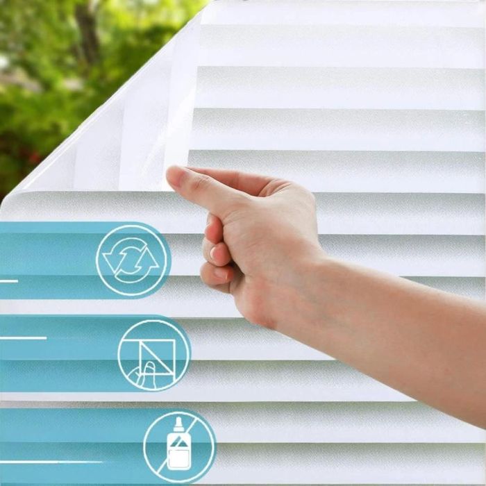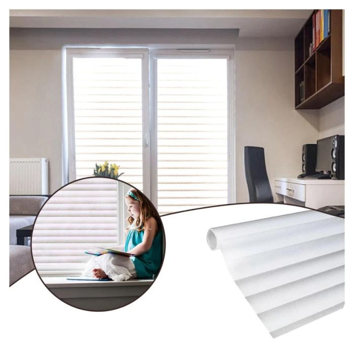 Removable striped blind film provides windows with extra protection against harmful sun rays and reduces heat inside the home, while maintaining your privacy. It is easy to install and remove without leaving any residue on the glass.