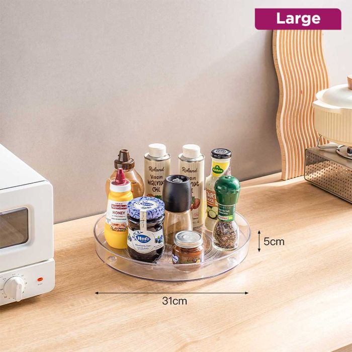 The perfect solution for smartly organizing your kitchen and bathroom. Its 360-degree rotating design gives you easy and instant access to everything you need, eliminating the clutter of spice or lotion bottles. Thanks to its non-slip surface and raised edges, everything will stay securely in place. It's a versatile tool that's ideal for organizing spices, cleaning supplies, cosmetics, or even medications.Today's Deal is Revolving Storage Shelf for Kitchen and Bathroom