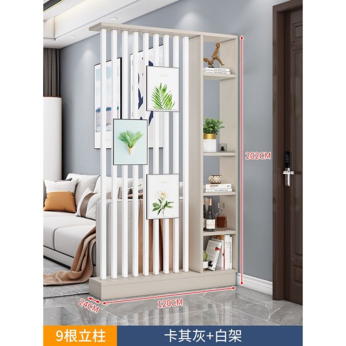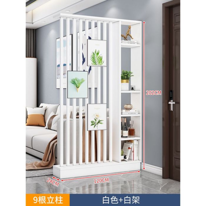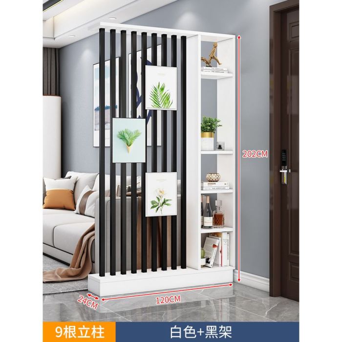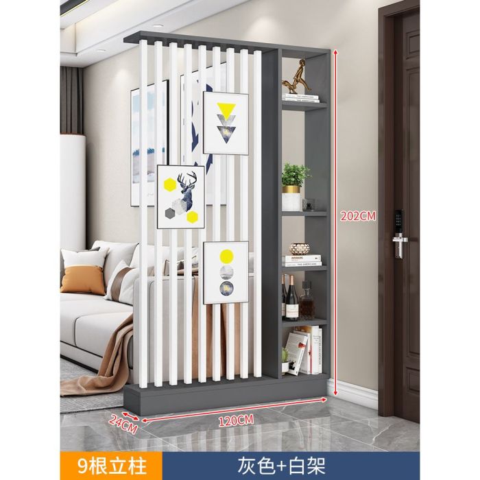 This Room divider with wooden shelves and 9 steel tubes made of particle board and a sturdy steel frame, modern design adds an elegant decorative touch, ideal for organizing space and displaying décor neatly while maintaining its quality