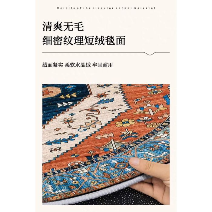 This Round rug with heritage design made of luxurious crystal velvet, providing an ultra-soft silky texture with attractive classic patterns, adding instant luxury to the space, easy to care for and maintains its quality, perfect for adding a warm aesthetic touch to your home.