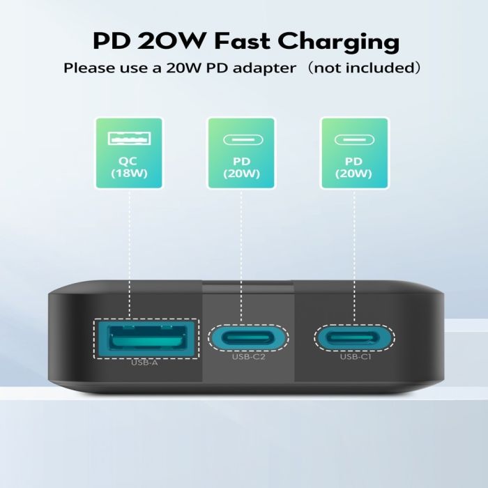 - USB-C Output (PD 3.0): 5V = 3A, 9V = 2.2A, 12V = 1.6A (20W Max)
