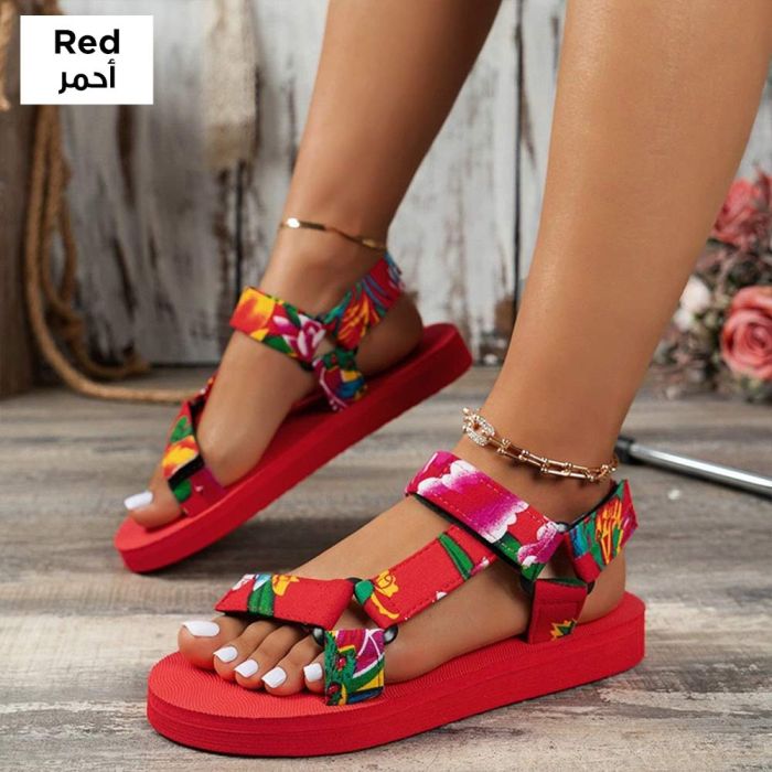 - Colorful Patch Ethnic Summer Sandals with Thick Sole and Velcro Closure - Big Flower - 36 - Red