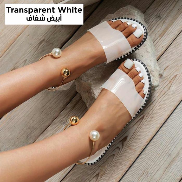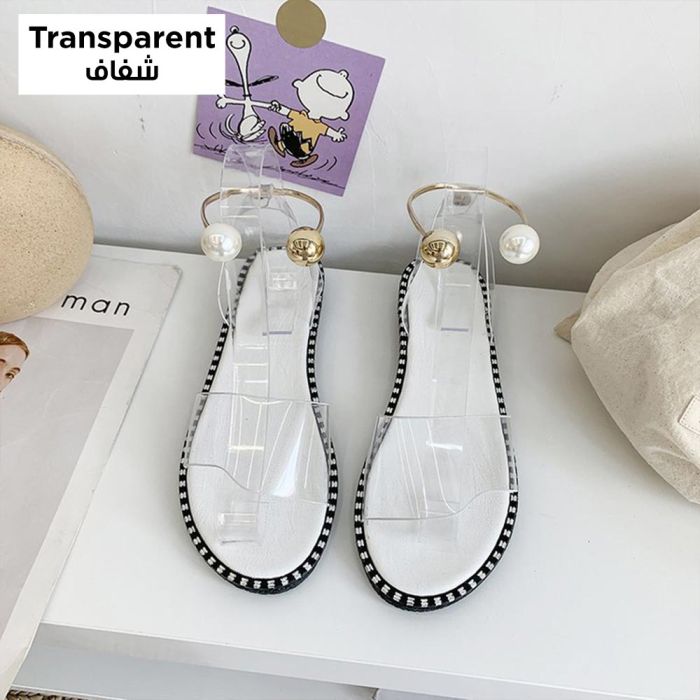 Transparent Flat Roman Sandals Open-Toe with Pearl Buckle for Women