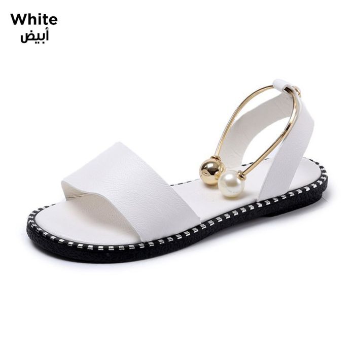- Simple Flat Roman Sandals Open-Toe with Pearl Buckle for Women - 35 - White