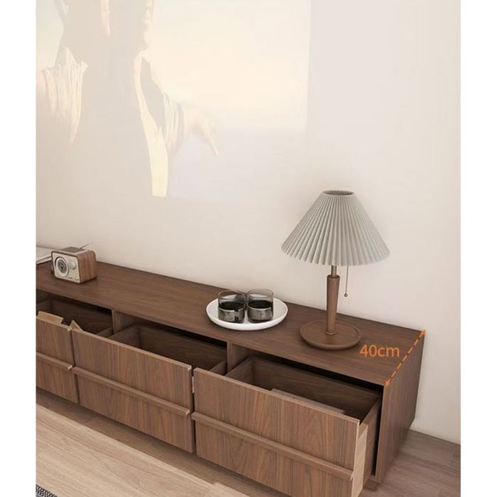 This Floor wooden TV cabinet with drawers made from carefully selected wooden materials, offering elegant organization and comfortable storage space, a low-profile design that blends seamlessly into the living room and adds warmth and order
