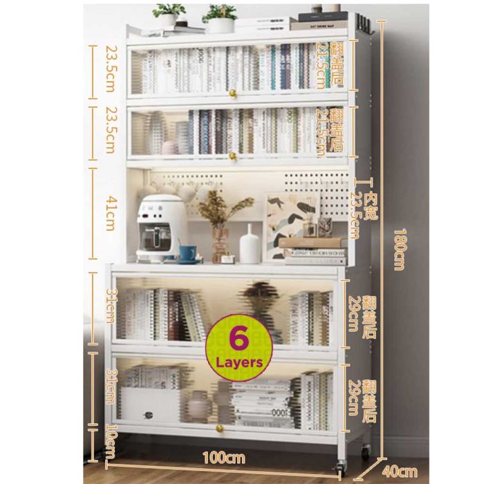 This multi layer metal cabinet with acrylic doors and wheels is made of a durable metal frame, featuring elegant transparent acrylic doors, a closed design that helps protect from dust, equipped with wheels for easy movement, offering comfortable organization and a tidy kitchen space