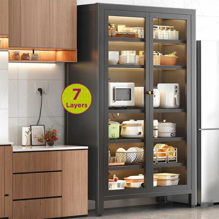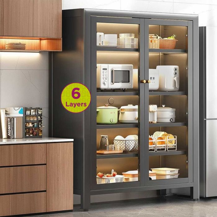 This multi purpose metal kitchen cabinet with doors is made of a durable carbon steel structure, featuring a closed design with tight doors that help protect contents from dust, offering organized storage spaces for kitchen appliances and essentials in a neat elegant way